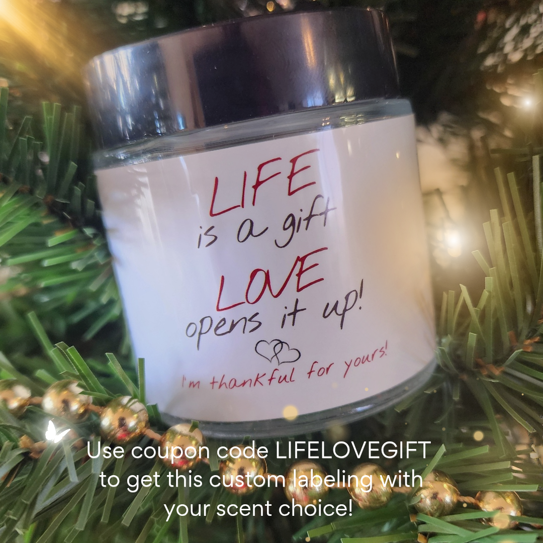 **If you want the Custom Label featured on Social Media, use coupon code: LIFELOVEGIFT and you'll get this custom label for FREE with the scent you choose in the options. If you choose "Create Custom Blend", you'll be sent a form where you can make additional choices for your labeling. We can't want for you to share this gift of love with someone special!**